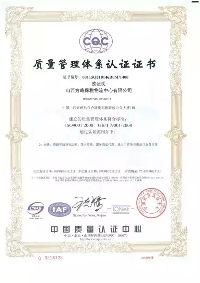 經過2年多的努力,方略保稅物流中心有限公司的質量管理體系在前期通過第一階段中國質量認證中心(英文簡稱CQC)審核的基礎上,近日按照程序,該公司又接受了第二階段的審核。通過審核,中國質量認證中心認為公司的質量管理體系完整充分、運行實施健康有效,符合ISO9001:2008的要求,故予頒發相應認證證書。本體系覆蓋:倉儲、道路普通貨物運輸、國內貿易、國際貨運代理、進出口貿易與進出口業務代理。保稅公司質量管理體系證書的取得,標志著該公司在質量管理體系的建立、運行和持續改進方面已擁有一套成熟的體系,同時通過體系運行可有效控制服務質量,為客戶提供持續的滿意服務。據了解,此次認證為初次認證,有效期三年。3年后將按體系認證程序的相關規定進行再認證。
