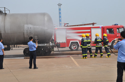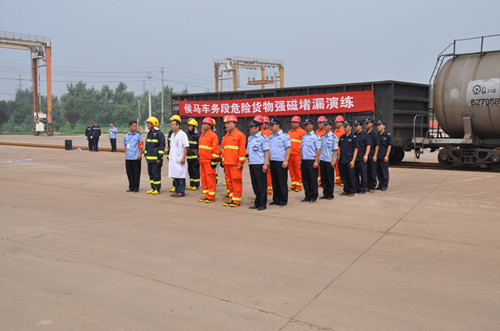 “所有人員進入演練序列!” 2013年7月30日上午10時50分,隨著指揮人員一聲令下,山西方略保稅物流中心二期場站侯馬北站方略專用線危險貨物強磁堵漏演練正式拉開帷幕。頓時消防、醫護警報四起,人員秩序井然,車輛排列有序。 10時30分,在所有人的期盼眼神中,演練隊伍以整齊劃一的隊列迎來了太原鐵路局貨運處沈冰處長一行數十人的參觀團,待來賓就位,物品發放完畢,主持人隨即做出演練開始的命令,在向領導就此次危險貨物強磁防堵演練的內容、背景及演練要求進行說明后,主持人宣布演練正式開始! 首先,此次為假定的汽油泄露事故情境,由貨檢員跑步向副站長,亦即此次演練現場總指揮報告本人身份、泄露時間、地點、車次、車號,副站長沉穩做出指示:“密切注意事故車輛泄露情況,注意周圍是否有火源,加強防護,疏散人員。”“是!”待貨檢員離開,副站長立刻跑步向總指揮,車站站長做報告事故情況,站長當場指示:“將事故車輛調入方略專用線一道,啟動侯馬北站危險貨物搶險應急預案。通知相關單位、搶險隊立即趕赴現場。現場人員注意觀察,隨時匯報!”“是!”接到命令后,副站長跑步歸位。 |