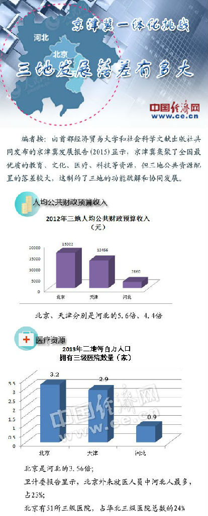 難度究竟有多大?從三地的發(fā)展落差上或可探得一二。首都經(jīng)濟(jì)貿(mào)易大學(xué)及社會科學(xué)文獻(xiàn)出版社16日共同發(fā)布的京津冀藍(lán)皮書《京津冀發(fā)展報告(2015)——協(xié)同創(chuàng)新研究》,也許能提供有益參考。