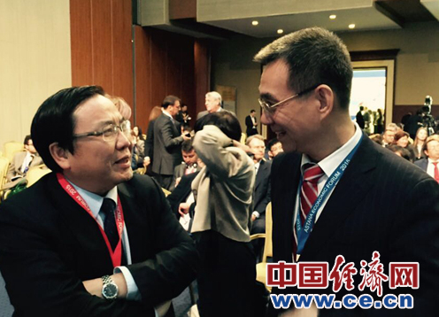 第八屆阿斯塔納經(jīng)濟(jì)論壇21日在哈薩克斯坦首都阿斯塔納的獨(dú)立宮拉開帷幕。圖為出席論壇的世界銀行前高級副總裁林毅夫、亞洲開發(fā)銀行副行長張文才在交流。中國經(jīng)濟(jì)網(wǎng)記者 崔軍 攝