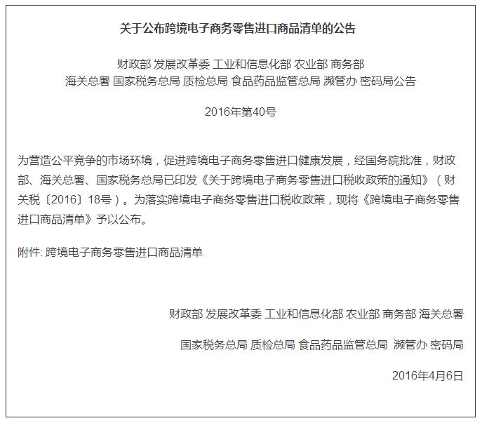 政策:關于公布跨境電子商務零售進口商品清單的公告