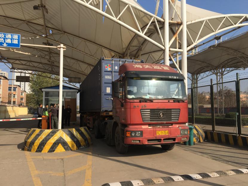 圖1:滿載樂視進口商品的海關監管車正由貨物通道通過保稅物流中心智能卡口進入海關監管區卸貨