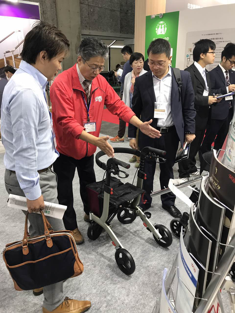 圖3:展會上安壽公司負責人川井毅也先生(中)向杜華明總裁(右)介紹參展產品--步行器