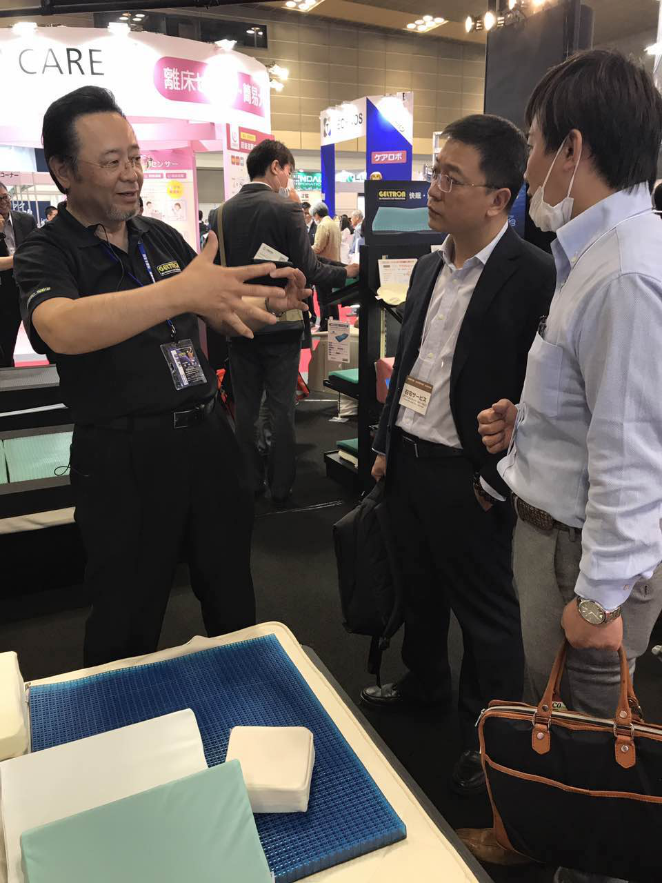 圖4:展會上膠制床墊參展商銷售代表田中啟介先生(左)向杜華明總裁(中)介紹參展相關產品