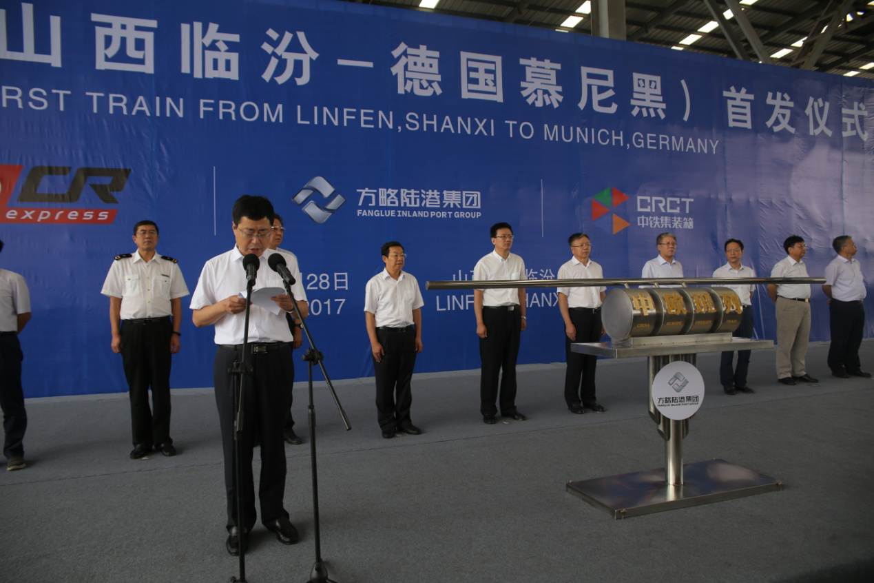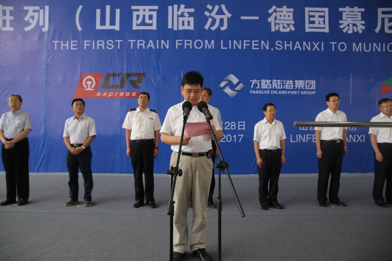 儀式上,臨汾市委書記岳普煜進行了熱情洋溢的致辭,他在致辭中說,習近平總書記在視察山西時指出“山西是‘一帶一路’大商圈的重要組成部分,要利用好我國交通發展和推進‘一帶一路’建設的歷史性機遇”,這是對山西拓展對外開放格局的重大定位和要求。省委十一屆四次全會提出要打造“內陸地區對外開放新高地”。開行“臨汾—慕尼黑”中歐班列,是貫徹習近平總書記視察山西重要講話精神的重大舉措,是貫徹落實省委、省政府決策部署的具體行動,也是臨汾市積極參與和服務“一帶一路”建設的有效途徑。他指出中歐班列的開行,為我省建設面向歐洲市場的出口生產基地提供了物流平臺,有利于加強山西省與國際間的交流合作,有利于進出口貿易和加工貿易產業在我省落地,商品在此集結,為山西企業走出國門、走進歐洲市場開辟了一條全新的通道。臨汾市將以此為重大契機,在省委、省政府的堅強領導下,把臨汾建設成為我省向西開放的前沿陣地,努力為山西深度參與“一帶一路”建設作出積極貢獻。他希望侯馬市委、市政府繼續保持攻堅克難、奮勇爭先的工作狀態,持續加大與有關部門和企業的溝通對接,服務保障班列順利運行。方略陸港集團要切實加強運營管理,不斷開拓貨源渠道,積極對接中亞、歐洲市場,推進班列常態化運行,真正把中歐班列打造成拉動需求、拓展空間的發展班列,安全快捷、綠色環保的放心班列,增進友誼、互動共贏的合作班列,進一步提升臨汾的國際影響力、綜合競爭力和輻射帶動力,推動臨汾經濟社會持續健康發展。