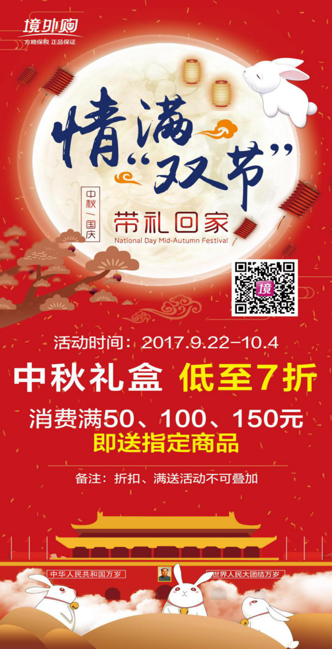 情滿“雙節”,帶禮回家。為滿足廣大消費者在中秋、國慶兩節來臨之際的購物需求,2017年9月22日至10月4日,方略陸港集團境外購太原南站線下體驗店開展了“中秋國慶雙節”專場促銷活動,吸引了客戶的踴躍采購。