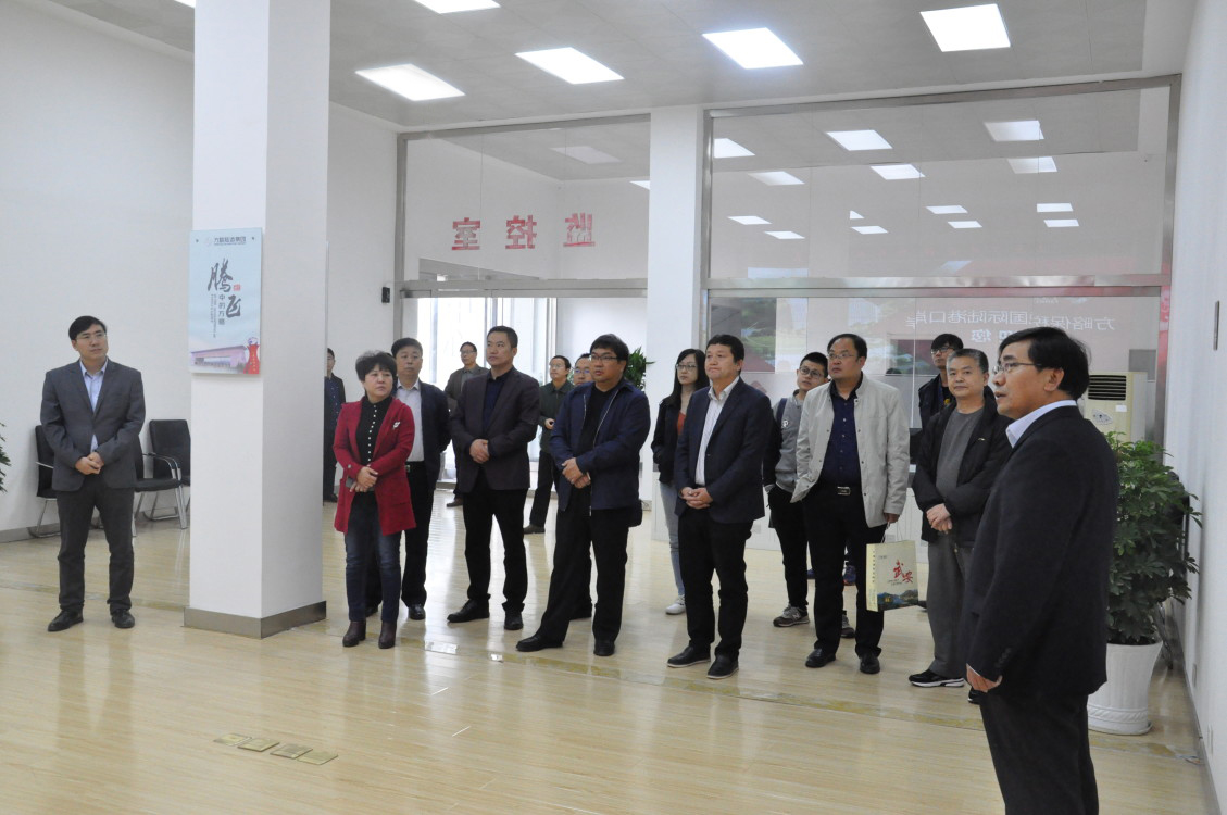 圖1:河北武安保稅物流中心管委會主任李鋼成(前排左四)一行在展廳聽取督查審計部部長衛跟上做方略保稅物流中心建設與發展情況介紹,侯馬市副市長張紅玉(前排左二)等領導陪同