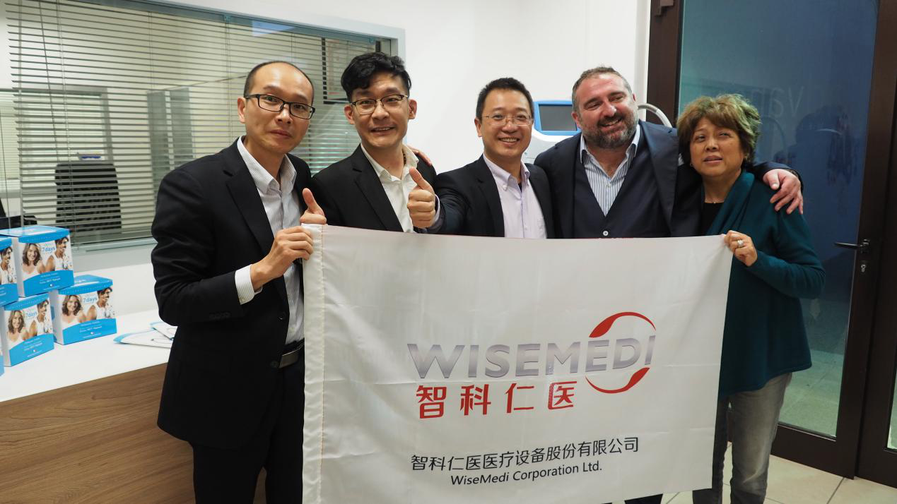 圖1:醫療器械設備運營部總裁杜華明(左二) 、網絡科技運營事業部總裁陳克軍(左一)共赴意大利Eximia公司實地考察學習受到熱烈歡迎