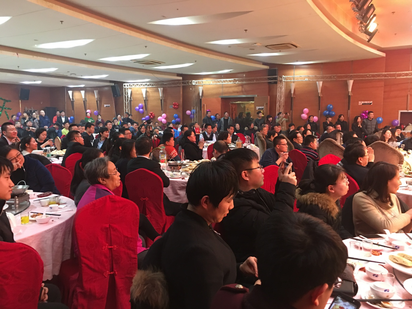 圖:8:晚會現場員工及家屬一邊就餐一邊興致勃勃地收看節目,在無比的歡快中大家分享著去歲的收成、共同迎接美好的未來