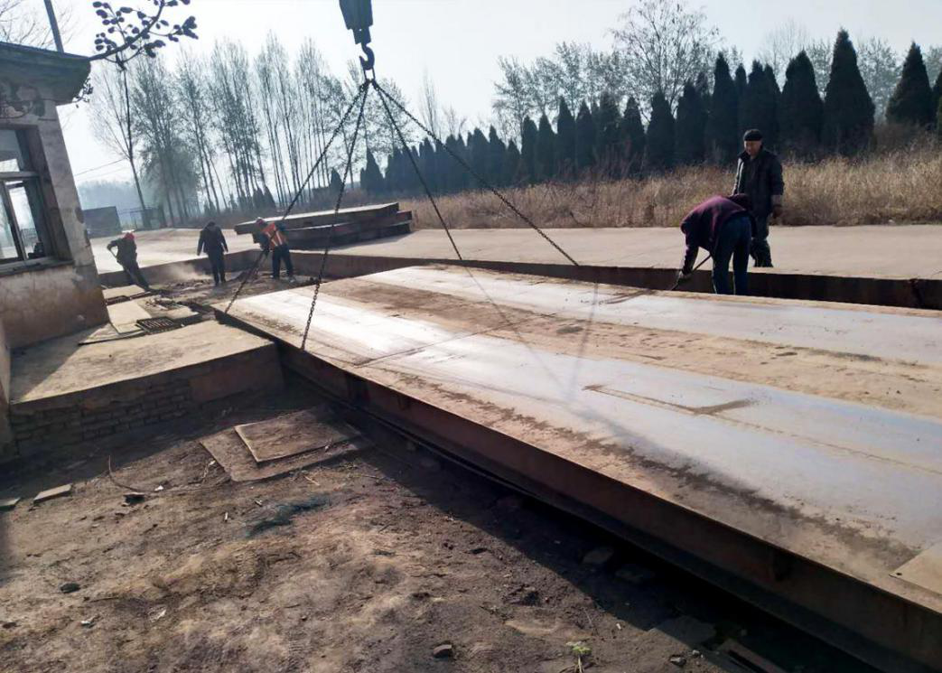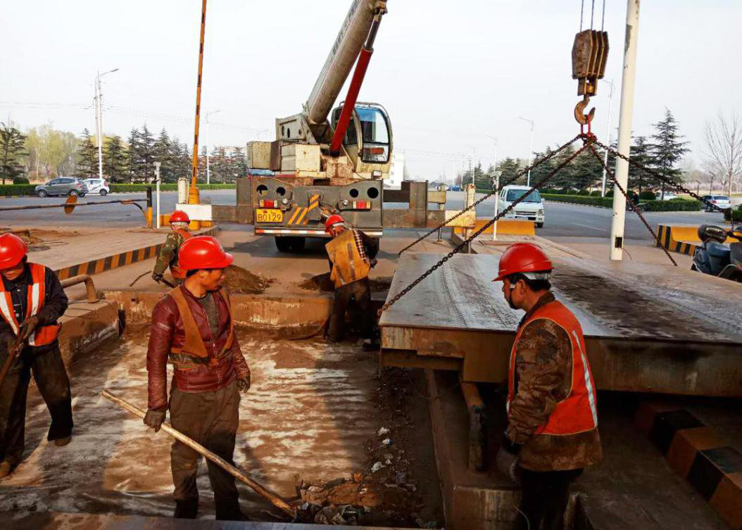 圖2:吊車將總載重12噸、分為四小塊的地磅分別打開,吊移磅槽外之后,工作人員對地磅的關鍵性零件進行檢修