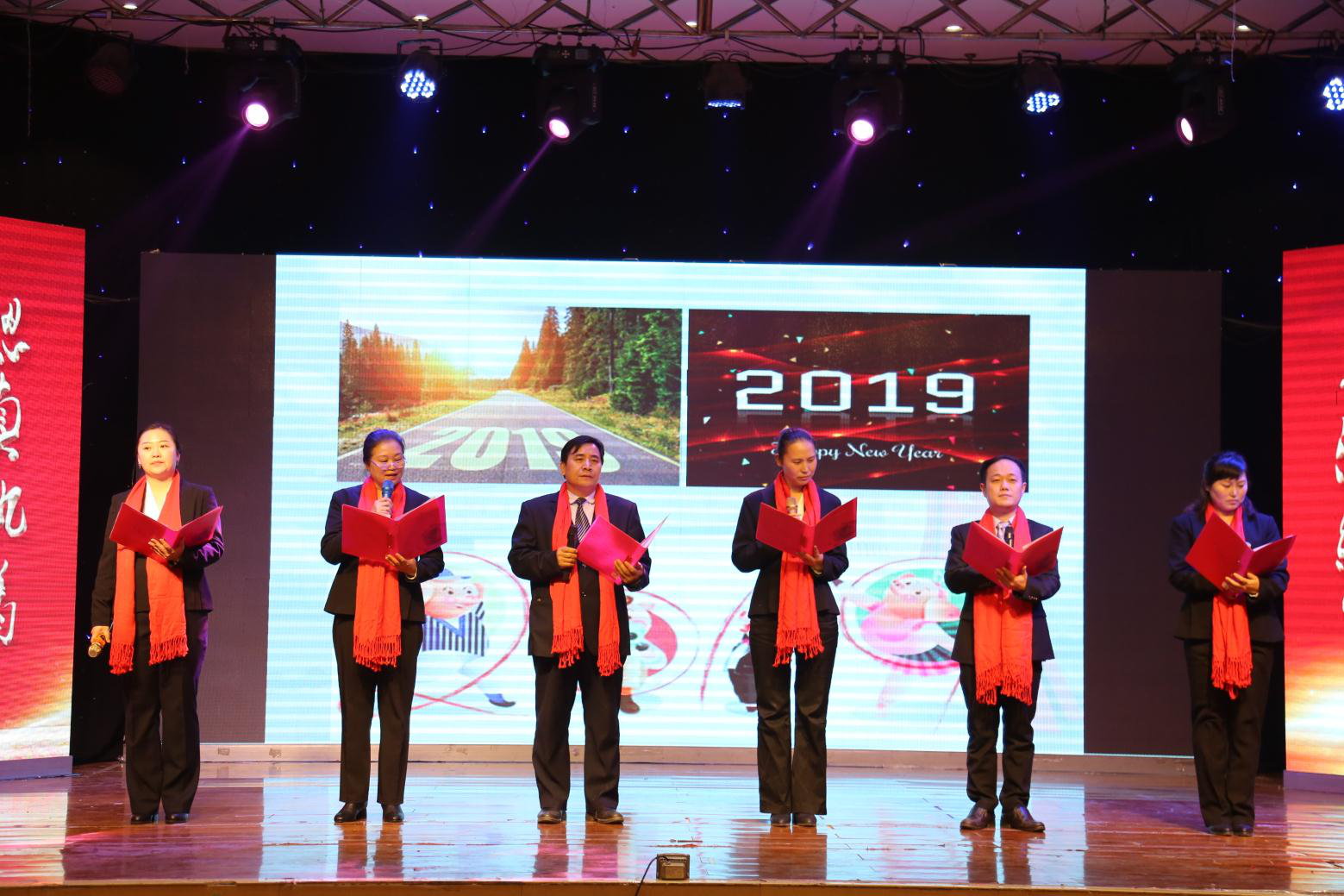 晚會在晚上八時正式開始。只見二位主持人一齊走上舞臺,對到場的各位領導、同事、家屬表示了最熱列的歡迎,隨后邀請李海瑕董事長致新年賀辭。