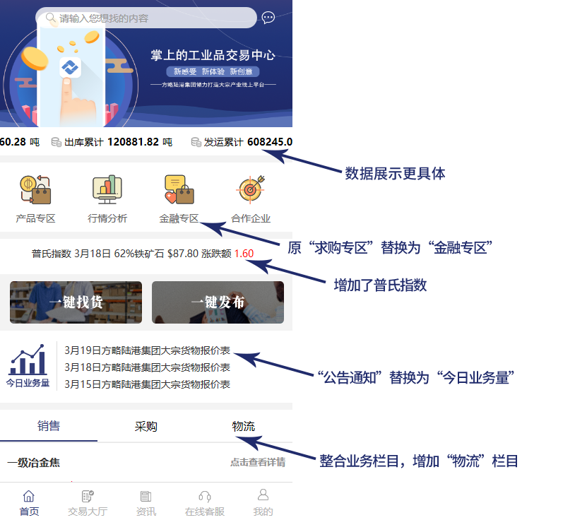 具體而言就是在界面首屏中,增加了平臺(tái)每日數(shù)據(jù)展示內(nèi)容,具體到出庫累計(jì)、發(fā)運(yùn)累計(jì)等,使用戶能更具體的看到平臺(tái)交易量動(dòng)態(tài)播報(bào);以“金融專區(qū)”代替原有“求購專區(qū)”,使需要解決資金問題的用戶更便捷的進(jìn)行相關(guān)操作;增加了“普氏指數(shù)”播報(bào),給用戶最新的行情資訊,做到交易心中有數(shù);以“今日業(yè)務(wù)量”替換原有“公告通知”,推送更精準(zhǔn)的報(bào)價(jià)單,提高報(bào)價(jià)效率;整合了原有的業(yè)務(wù)欄目,保留“銷售”“采購”欄目,并增加了“物流”欄目,也是為使有物流業(yè)務(wù)服務(wù)需求的用戶提供更方便快捷的入口。