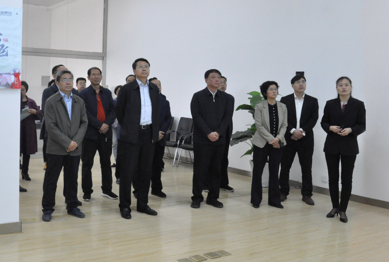 圖:山西省政協(xié)原副主席張璞(左一)、經(jīng)濟委員會主任孫躍進(左二)在園區(qū)展廳聽取工作人員介紹集團情況