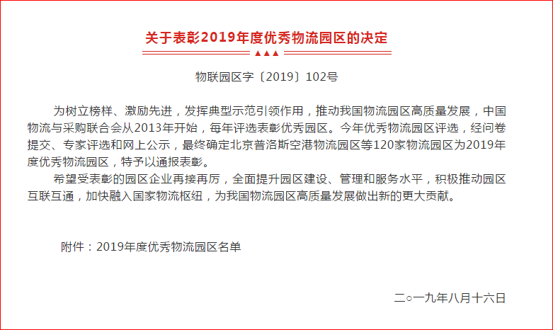 圖4:2019年度全國(guó)優(yōu)秀物流園區(qū)名單公布文件(摘錄)