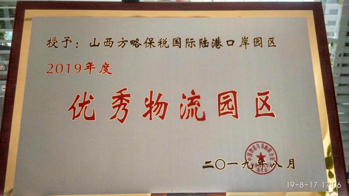 圖1:山西方略保稅國(guó)際陸港口岸園區(qū)榮膺2019年度全國(guó)優(yōu)秀物流園區(qū)稱(chēng)號(hào),此為中物聯(lián)物流園區(qū)專(zhuān)委會(huì)頒發(fā)的牌匾