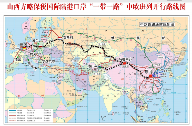 圖5:從 2017年7月以來,利用自身所處“一帶一路”節點、內陸港匯聚優勢及周邊產業比較優勢,山西方略保稅國際陸港口岸常態化開行了多線路多趟中歐班列,使“山西制造”通過西部陸地新通道走向了世界
