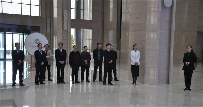 圖1:陽煤豐喜集團執行董事趙哲軍(右二)一行在方略保稅國際陸港口岸園區口岸聯檢辦公大樓大廳聽取工作人員介紹情況,集團董事長李海瑕(右一)陪同并進行熱情接待