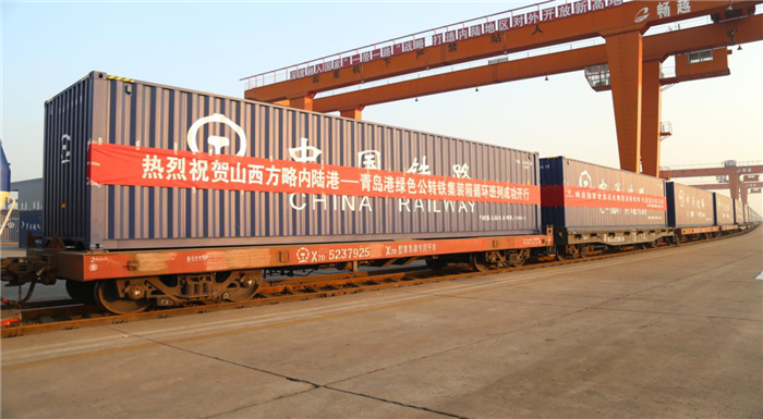 圖1:裝滿精密鑄件的50個40英尺鐵路加強型集裝箱搭載至山東青島港方向的綠色公轉鐵集裝箱循環班列即將駛出山西方略內陸港