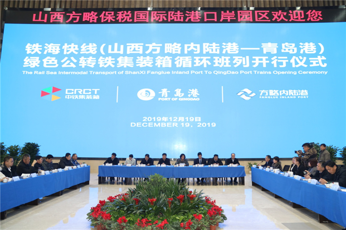 在班列開行之際,侯馬市委市政府、中國鐵路集裝箱有限責任公司、山東港口集團、中國鐵路太原鐵路局集團公司、山西方略陸港集團、山西華翔集團共同在山西方略保稅國際陸港口岸園區舉行了開行系列活動,共同見證了班列的開行,共商進一步開行好班列之大計。
