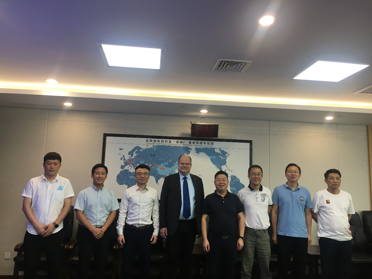 在考察過(guò)程中,成都國(guó)際鐵路港舉行了業(yè)務(wù)座談會(huì)。會(huì)上,鄭泉峰主任介紹了成都中歐班列開(kāi)行以來(lái)的有關(guān)情況。他講到,七年間成都中歐班列累計(jì)開(kāi)行超過(guò)了5000列,年均增長(zhǎng)率達(dá)120%以上;2019年進(jìn)出港貨值1250億元。全面拓展了12條國(guó)際鐵路和海鐵聯(lián)運(yùn)通道,境外直達(dá)站點(diǎn)增至26個(gè),境內(nèi)互聯(lián)互通城市擴(kuò)至15個(gè)。依托班列、保稅物流中心(B型)及綜合保稅區(qū),大力發(fā)展保稅物流、運(yùn)貿(mào)一體化及跨境電商,推動(dòng)國(guó)際貿(mào)易上規(guī)模、創(chuàng)特色。堅(jiān)持貿(mào)產(chǎn)互融,增強(qiáng)產(chǎn)能帶動(dòng),打造集在線交易、金融服務(wù)于一體的大宗商品交易平臺(tái),促進(jìn)內(nèi)外貿(mào)聯(lián)動(dòng)。隨后,弗蘭克修爾彩總經(jīng)理進(jìn)行了發(fā)言。他指出DB(Deutsche Bahn)長(zhǎng)期以來(lái)一直在歐洲和中國(guó)之間開(kāi)展鐵路貨運(yùn)業(yè)務(wù),其中集裝箱業(yè)務(wù)更是表現(xiàn)出良好的發(fā)展趨勢(shì),希望今年通過(guò)大家的共同努力爭(zhēng)取集裝箱業(yè)務(wù)量突破100,000個(gè)。最后,徐進(jìn)副總裁進(jìn)行了發(fā)言。他首先對(duì)成都國(guó)際鐵路港在集團(tuán)開(kāi)行的俄羅斯運(yùn)至成都青白江的改性瀝青回程班列業(yè)務(wù)中所給予的大力支持表示感謝,同時(shí)表示集團(tuán)今后將積極發(fā)揮當(dāng)?shù)亟?jīng)營(yíng)網(wǎng)點(diǎn)優(yōu)勢(shì),組織更多品類(lèi)的貨源與德鐵、成都國(guó)際鐵路港進(jìn)行緊密合作,努力實(shí)現(xiàn)合作共贏。
