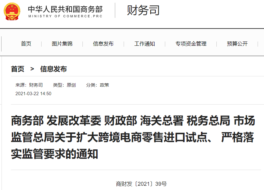 經國務院批準,2020年3月18日,商務部、發展改革委、財政部、海關總署、稅務總局、市場監管總局等六部門聯合印發《關于擴大跨境電商零售進口試點、嚴格落實監管要求的通知》(商財發〔2021〕39號,以下簡稱《通知》)。