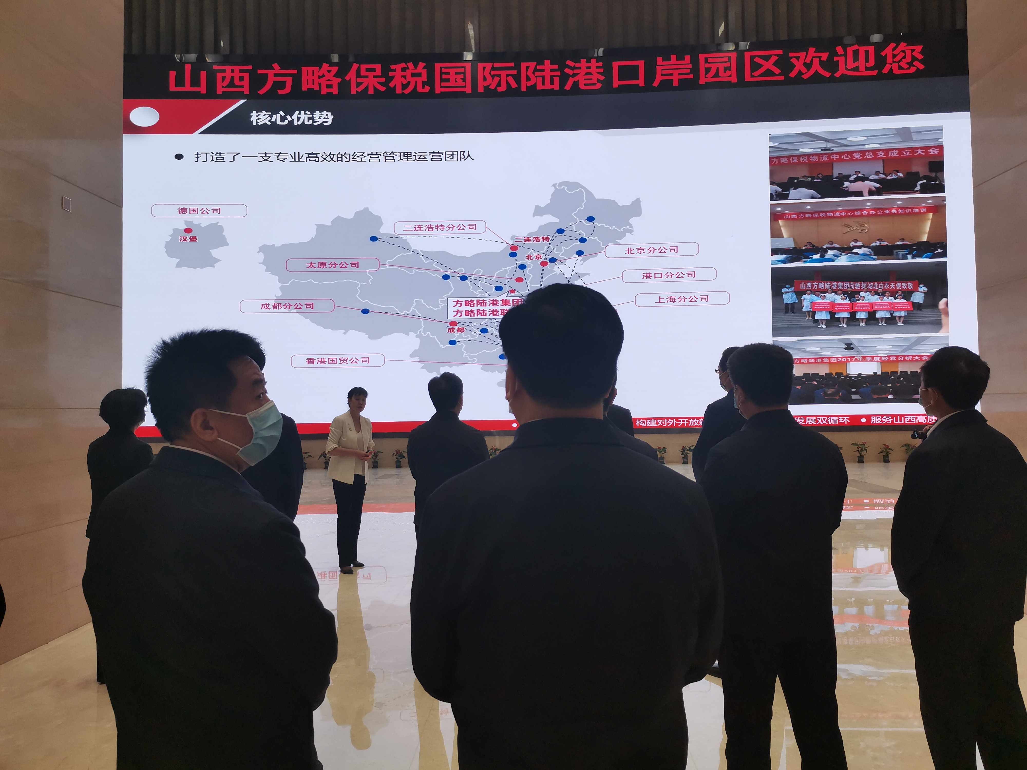 樓陽生書記一行首先來到口岸聯檢辦公大樓一樓聯檢服務大廳顯示屏前聽取了李海瑕董事長關于山西方略保稅國際陸港口岸園區項目概況、核心優勢、業務模式、依托山西方略保稅國際陸港口岸園區+山西方略保稅物流中心(B型)升級臨汾(侯馬)綜合保稅區、發展方向等情況的匯報。