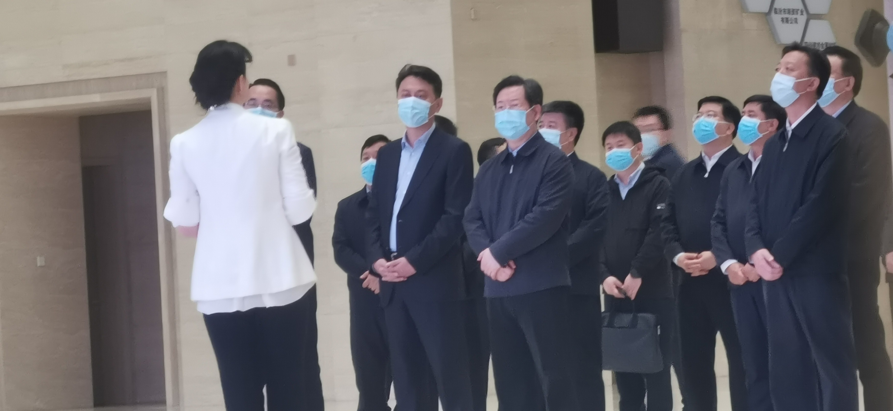圖1 2021年4月20日下午,山西省委書記樓陽生一行蒞臨山西方略保稅國際陸港口岸園區調研指導,山西方略陸港集團董事長李海瑕進行了熱情接待,圖為李海瑕董事長在一樓服務大廳顯示屏前向樓陽生書記一行匯報工作