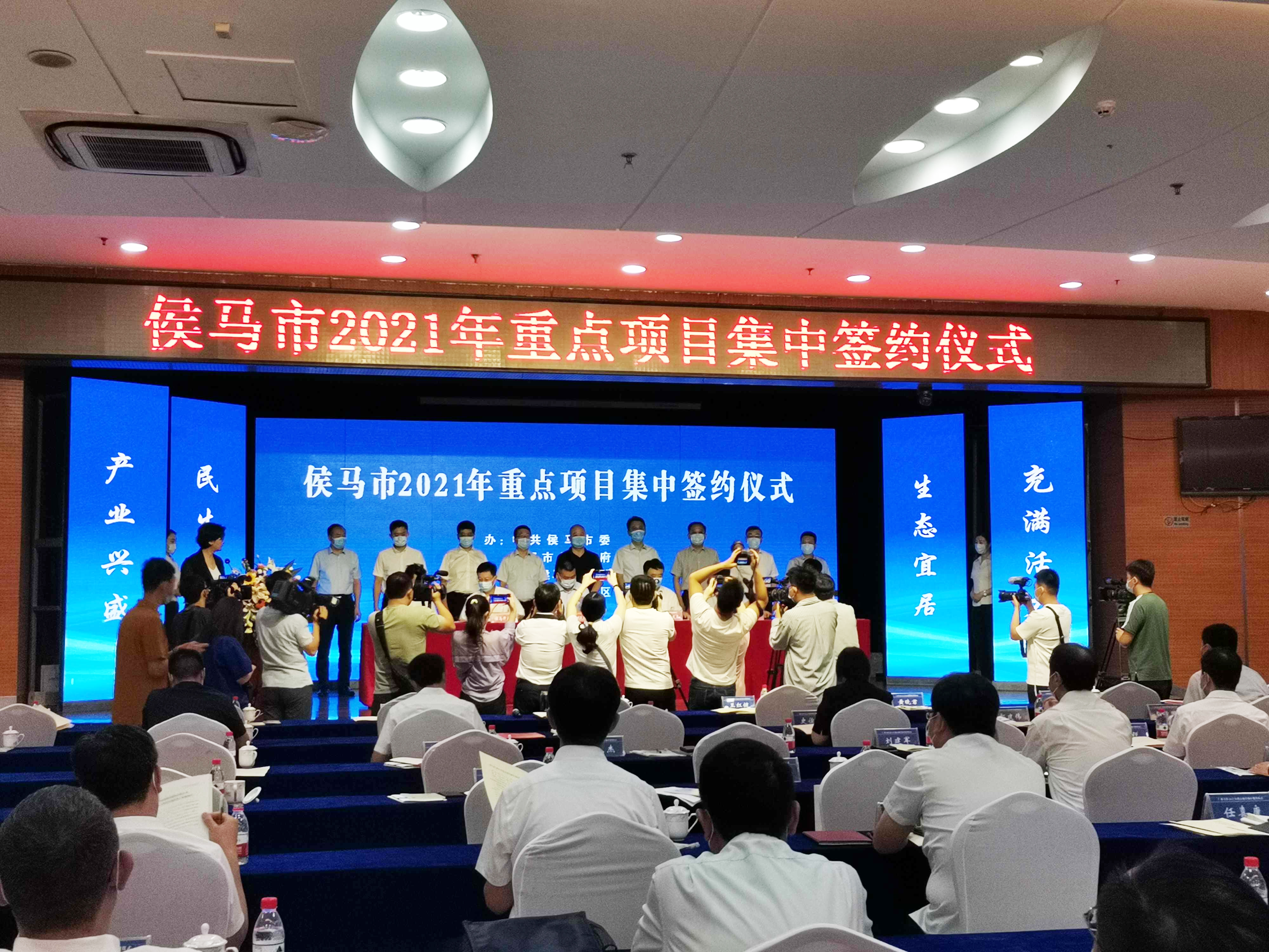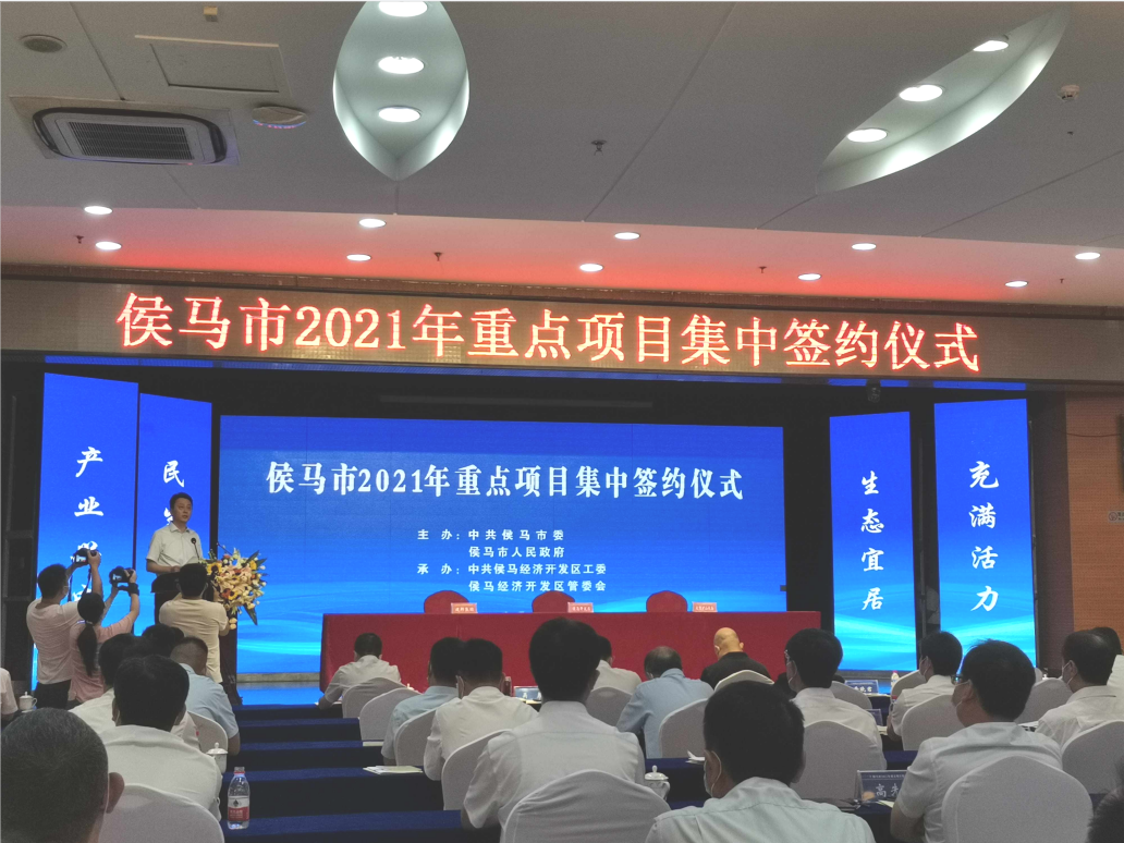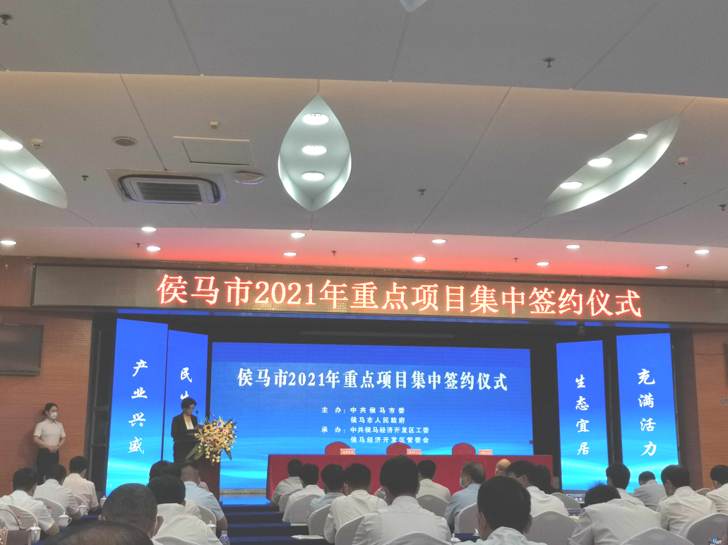 2021年8月25日上午,侯馬市委市政府在華強大酒店隆重舉辦了侯馬市2021年重點項目集中簽約儀式。儀式由市委副書記、市長黃曉君主持。參加會議的政府部門代表有省政府駐廣州辦事處黨組成員、副主任王紅建,臨汾市促進外來投資局局長陳艷剛,臨汾市商務局副局長聶磊。另外還有侯馬市四大班子主要領導,開發區主要領導,相關鄉辦,市直部門主要負責同志,簽約項目方代表和開發區部分重點企業負責人,以及西安臨汾商會、太原侯馬商會、侯馬浙江商會的負責同志。集團副總裁衛跟上出席了簽約儀式。