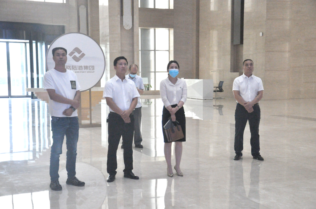 圖1 歐冶鏈金(蚌埠)再生資源有限公司總經理周榮鳳(右二)一行在口岸聯檢辦公大樓一層大廳聽取工作人員介紹園區整體情況,集團副總裁徐進(左二)進行了熱情接待