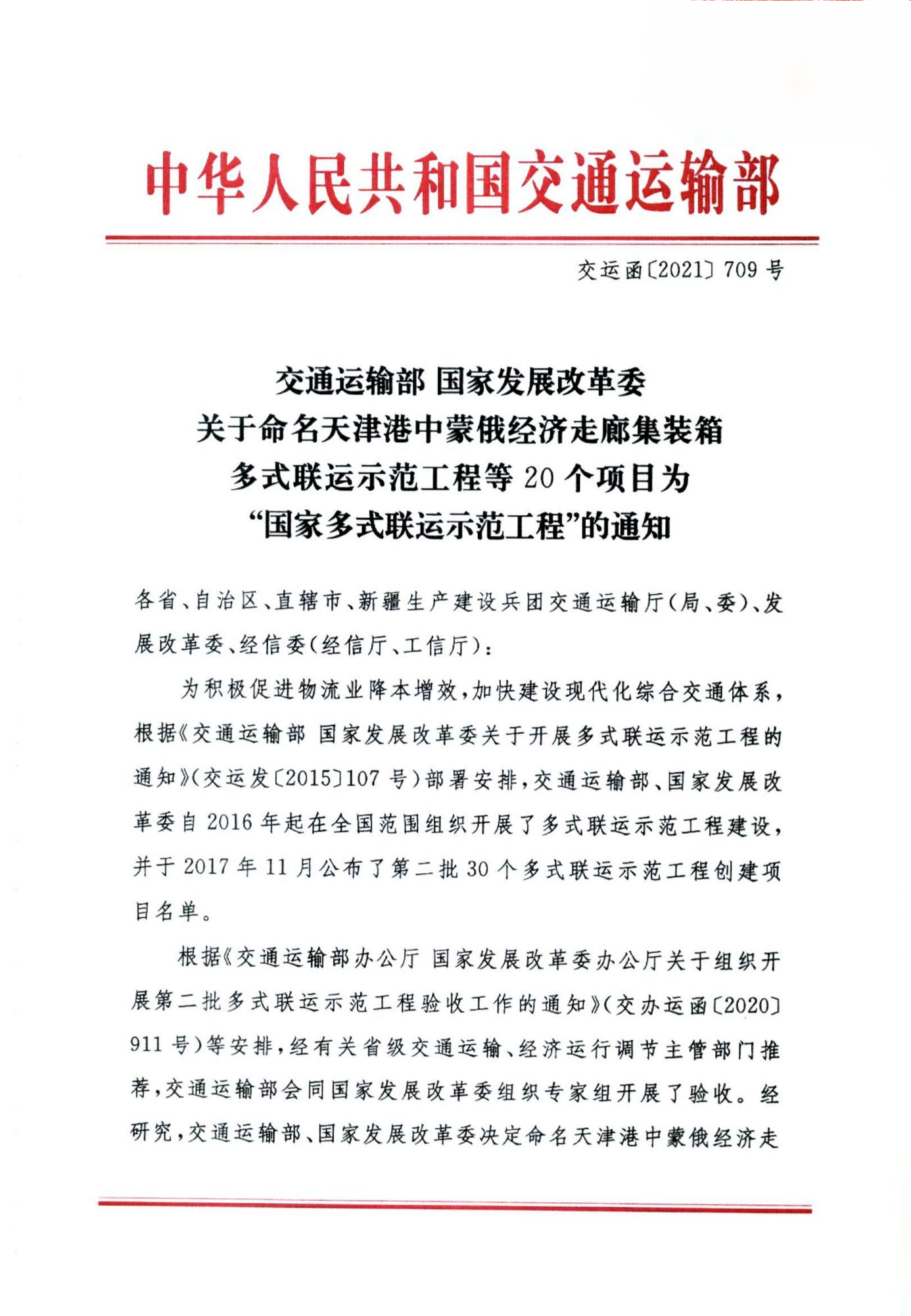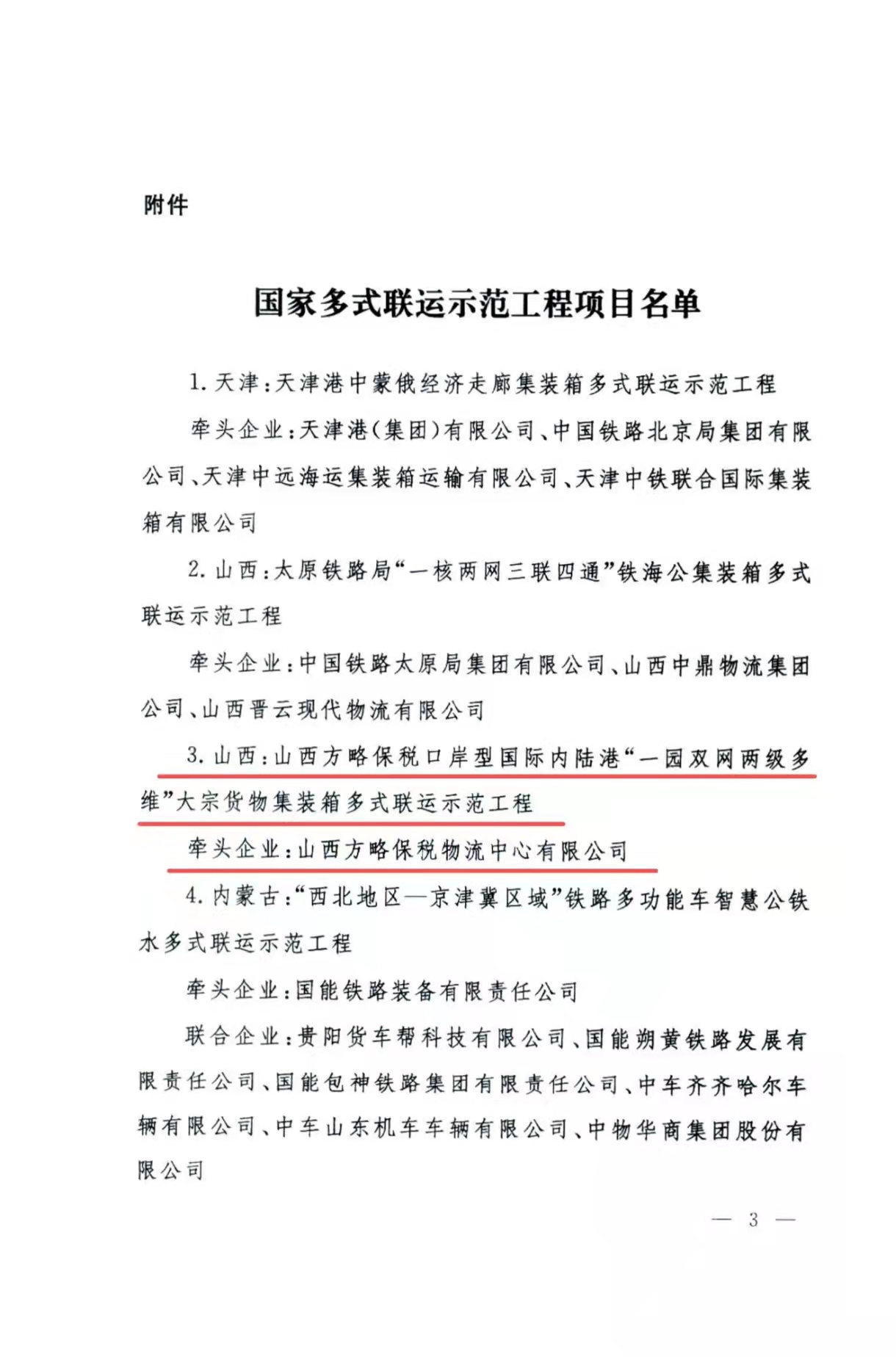 近日,交通運輸部下發通知(交運函【2021】709號),由方略陸港集團旗下山西方略保稅物流中心有限公司負責實施的多式聯運項目,被交通運輸部國家發展改革委共同命名為“國家多式聯運示范工程”。