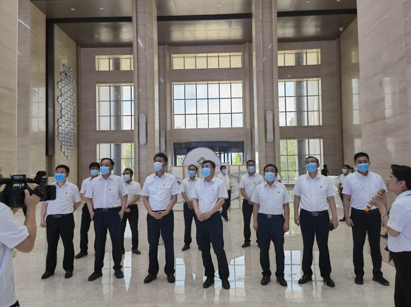 圖 2022年6月21日,晉城市委常委、晉城市城區區委書記孫世新(中)帶領晉城城區考察團蒞臨方略保稅國際陸港口岸園區調研指導工作,侯馬市委書記吳勇(左三)等領導陪同調研,圖為考察團在口岸聯檢辦公大樓大廳聽取工作匯報
