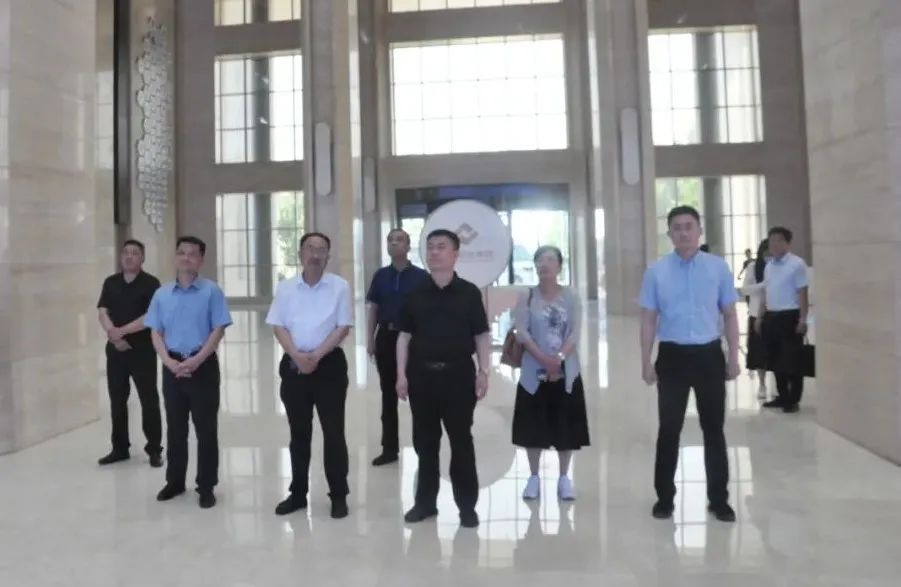 圖 2022年6月23日,山西省商務廳焦育峰副廳長(中)帶領調研團隊蒞臨方略保稅國際陸港口岸園區開展“助企紓困入企服務大調研”活動,臨汾市商務局局長白崗峰(左二),侯馬市委副書記、市長尹明星(左一)、副市長安危等領導陪同調研,圖為調研團在口岸聯檢辦公大樓大廳聽取工作匯報