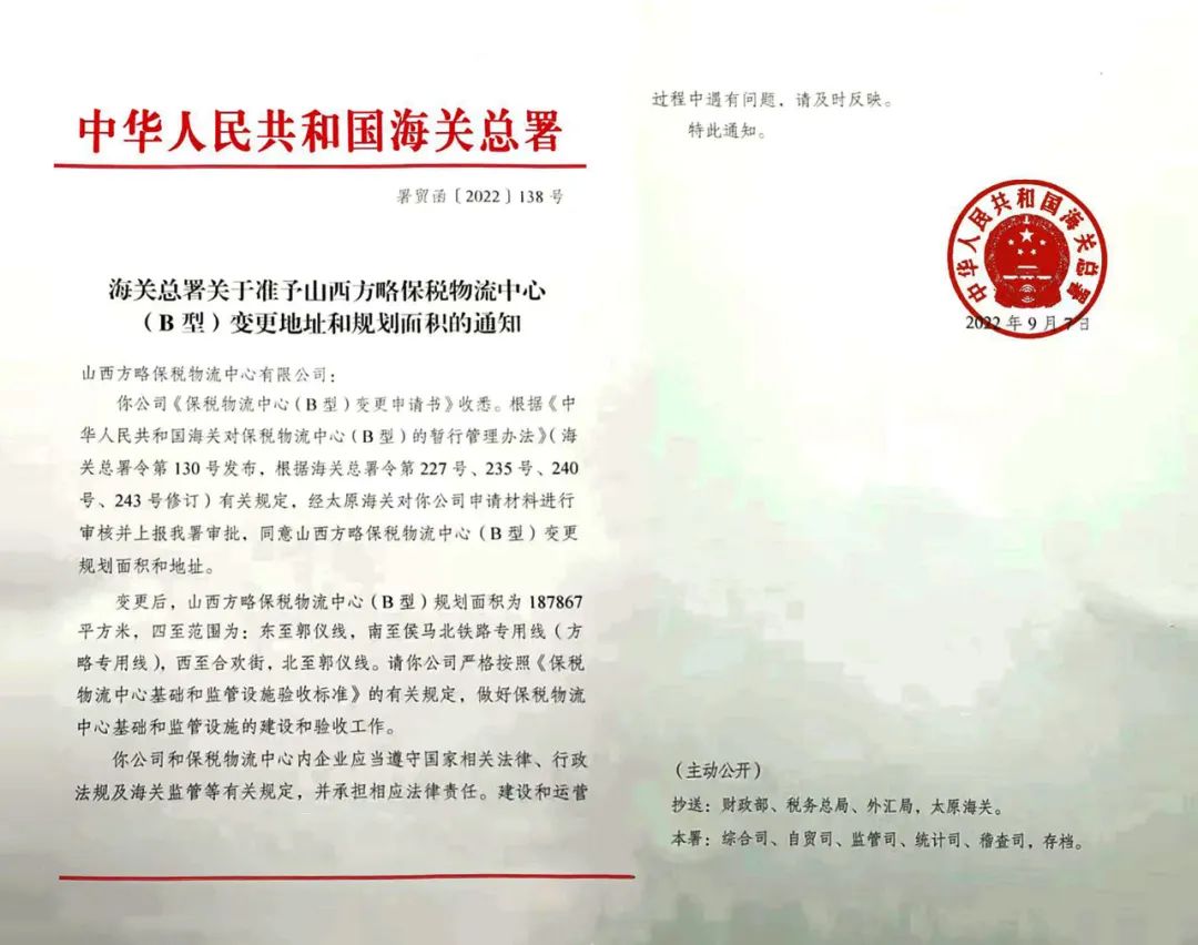 圖1 2022年9月7日,海關總署下發了關于準予山西方略保稅物流中心(B型)新址建設有關事宜的通知